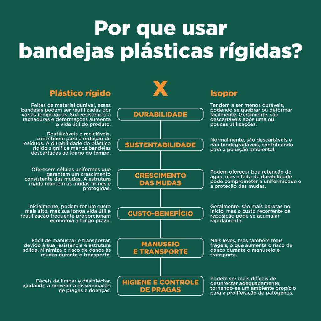 A estrutura rígida dessas bandejas oferece suporte robusto às mudas, garantindo que elas cresçam em um ambiente controlado e protegido. Diferente das bandejas de isopor, as bandejas plásticas rígidas são reutilizáveis, contribuindo para a sustentabilidade ao reduzir a necessidade de substituições frequentes e o descarte de materiais.