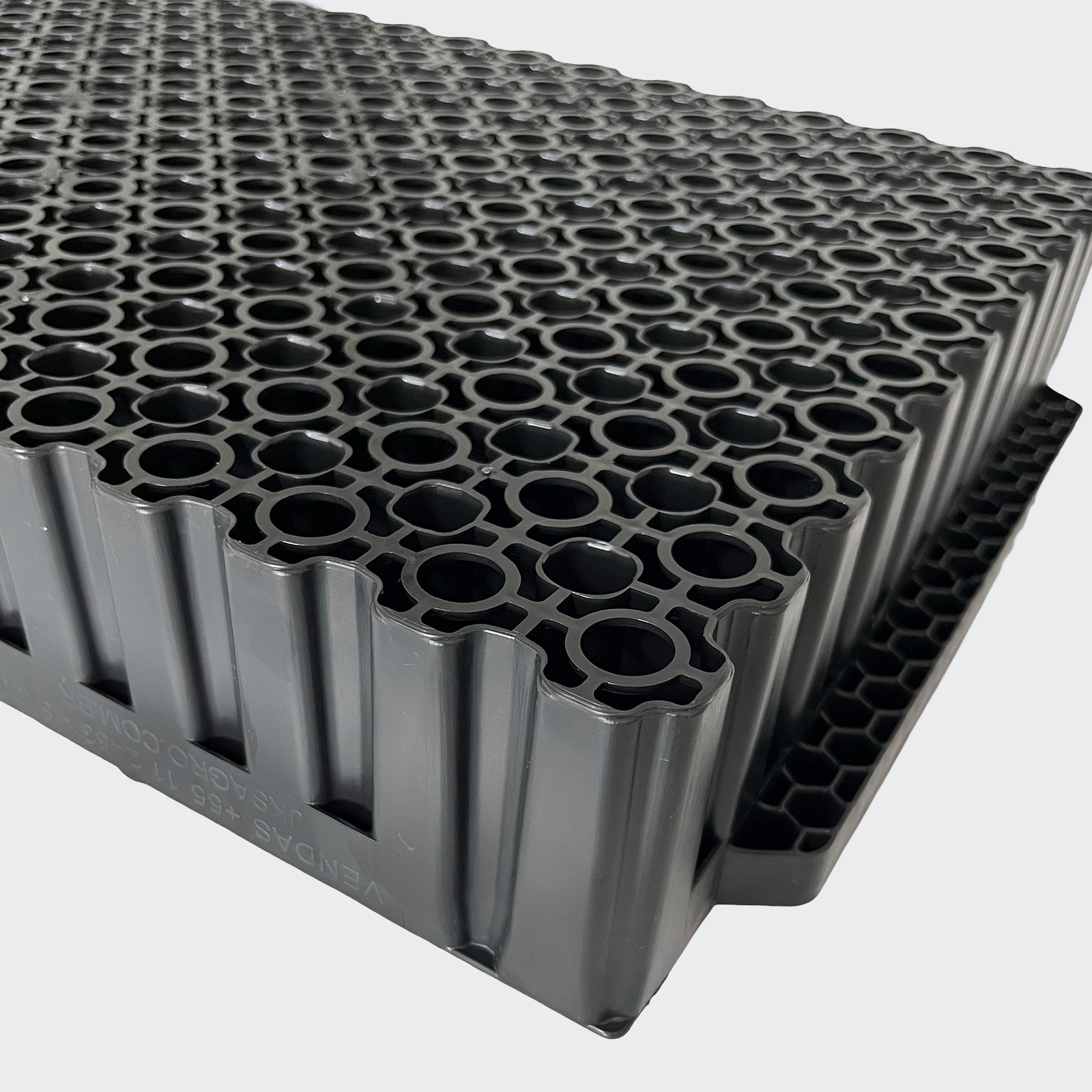 A abertura no fundo e no centro das células facilitam a remoção mecanizada, caso o viveiro utilize esse tipo de tecnologia. Cada célula possui quatro ressaltos angulares que garantem a centralização dos paperpots até a parte inferior da célula, seja no manuseio manual ou mecanizado.