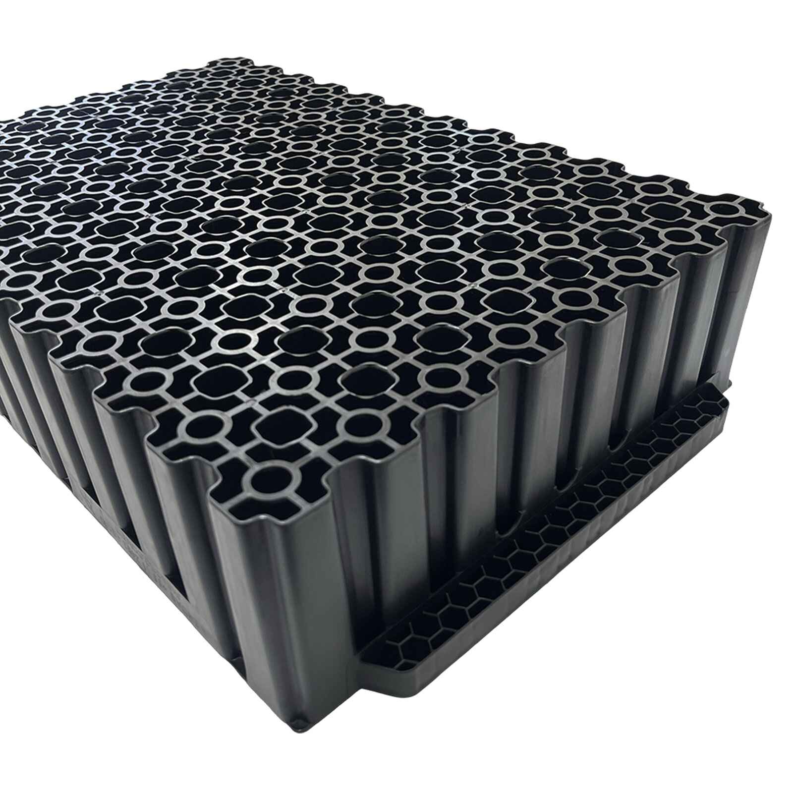 Recortes laterais nas células permitem a remoção manual dos paperpots, e a abertura no fundo e no centro das células facilitam a remoção mecanizada, caso o viveiro utilize esse manejo. Cada célula possui quatro ressaltos angulares que garantem a centralização dos paperpots até a parte inferior da célula, seja no manuseio manual ou mecanizado.