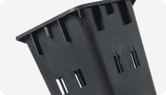 Seus 12 frisos internos direcionam as raízes verticalmente e melhoram a arquitetura do sistema radicular através da poda aérea e da brotação em todo o multipote. Com isso, temos uma drenagem eficiente, prevenindo encharcamentos e a incidência de fungos, garantindo uma excelente ancoragem das mudas no campo.